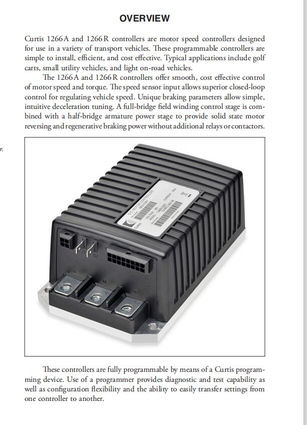 The 1266A-5201 motor speed controllers are ideal for a variety of electric vehicle applications, including industrial trucks, personnel carriers, material handling vehicles, tow tractors, walkie and small forklift applications, scrubbers, sweepers, scissors-lift and boom trucks, etc.
